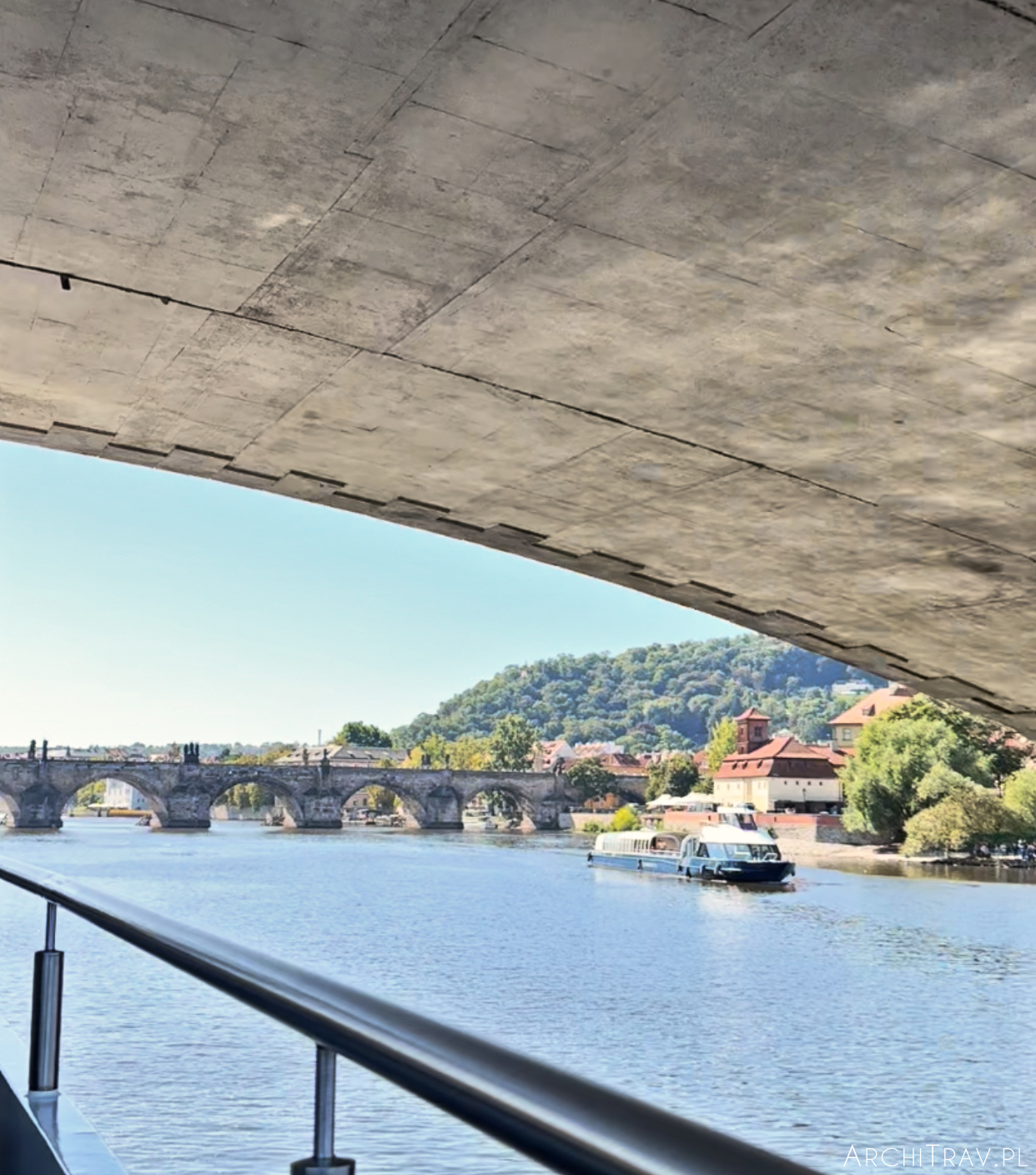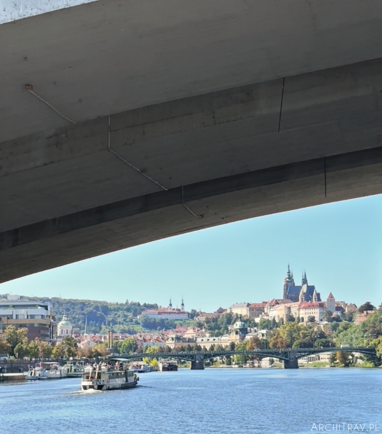 Ruszamy spod Mostu Svatopluka Čecha w stronę Mostu Štefánika – stąd możemy obejrzeć kawałek Wyspy Štvanice. Tuż za nim statek robi zawijkę i płyniemy w stronę Mostu Karola.